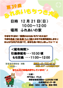 毎年12月3日~9日は「障害者週間」です。今年も各所でさまざまなイベントが企画されています。 ふれあいグループは鶴見区役所入口の区民ホールにて展示・販売に参加します。お時間のある方は是非お越しください。 また、障害者週間 […]